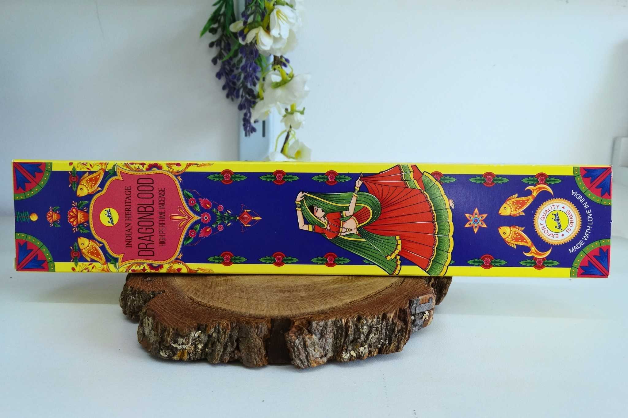 Produto: Incenso de Massala Indian Heritage – Dragonblood. Uso: Proteção, purificação intensa, coragem, atração de sorte e rituais de poder.