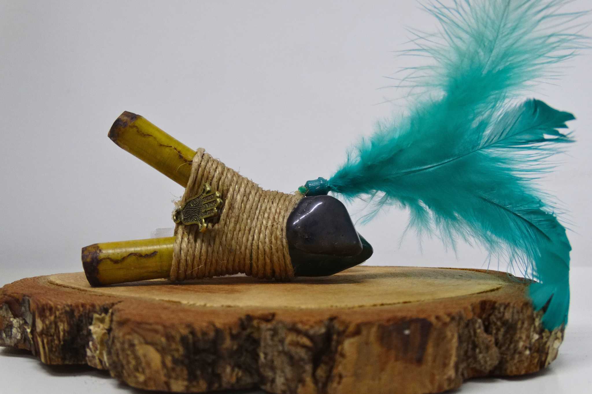 A estrutura de bambu oferece uma canalização natural e fluida, enquanto o detalhe da pena verde e o amuleto de Mão de Fátima simbolizam proteção, bênçãos e a força da conexão espiritual. A pedra de Granada Espessartita central atua como um cristal de poder, trazendo vitalidade, coragem e manifestação, perfeito para quem busca aprofundar a conexão com o sagrado e materializar seus objetivos.